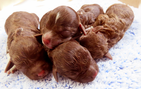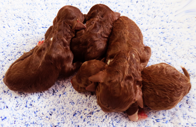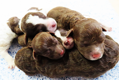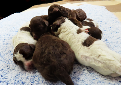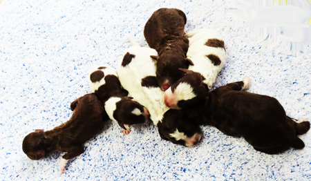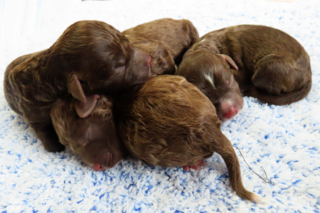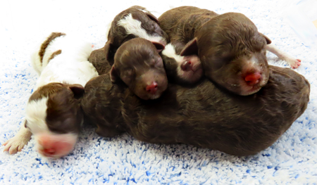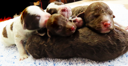 Hier sehen Sie die Kleinen Hündinnen und sie sind alle braun mit etwas weiß